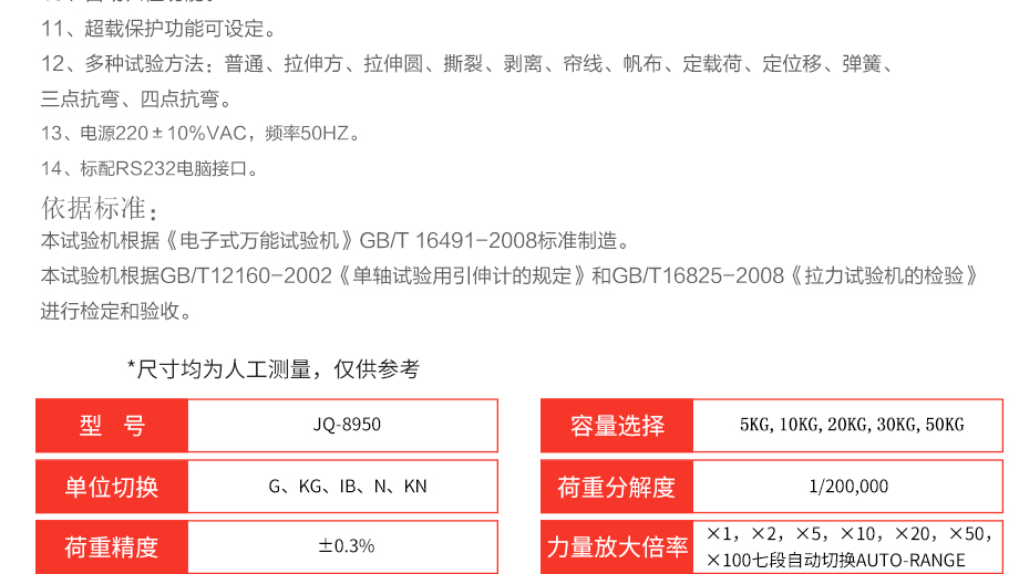 產(chǎn)品型號:JQ-8950 品牌:劍 喬 用途:本系列機廣泛用于各類薄膜、五金、橡膠料、紡織、建材、絕緣體、電線、電纜、端子等各類材料。測試其拉伸、撕裂、穿刺、剝離、抗壓、彎曲、抗剪切、定荷重、定位移、三點抗折